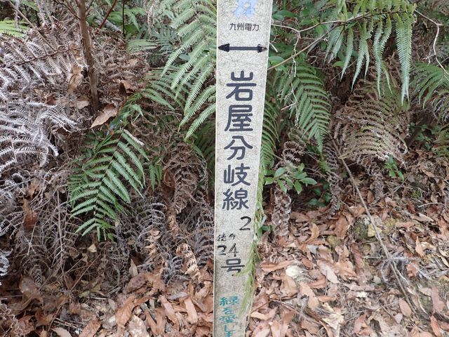 赤テープを拾いながら尾根道を下っていき、九電の鉄塔標識「岩屋分岐線1号」に出会ったら