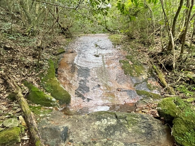 滑りやすいルートを足元注意で進んで…