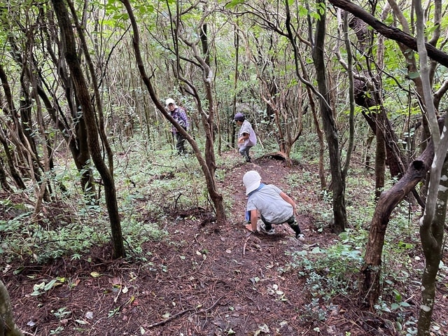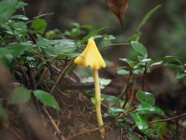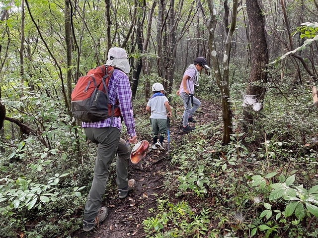 雨で濡れ滑り易くなった山路を登離、