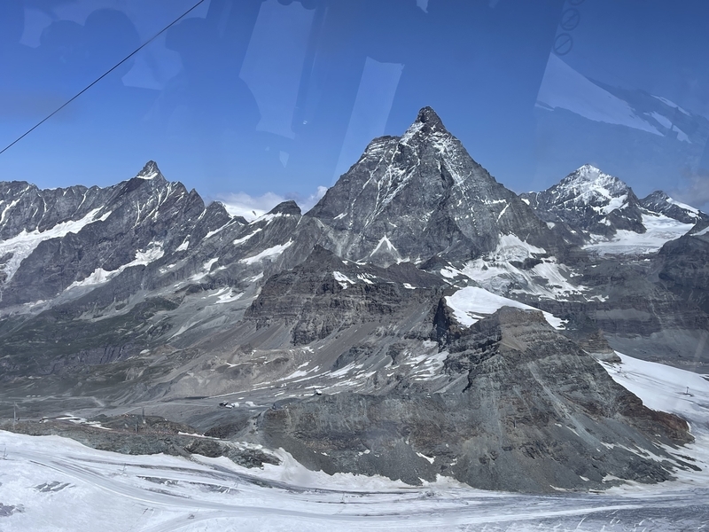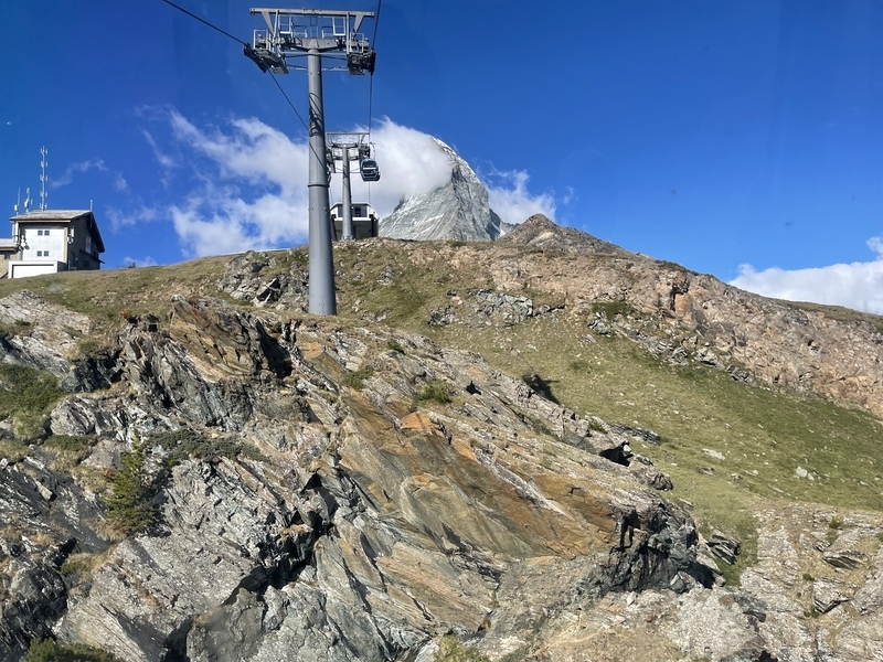 ロープウェイに乗ってマッターホルンを見ると、雲が取れて山頂が顔を出していました!