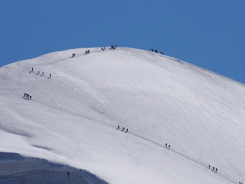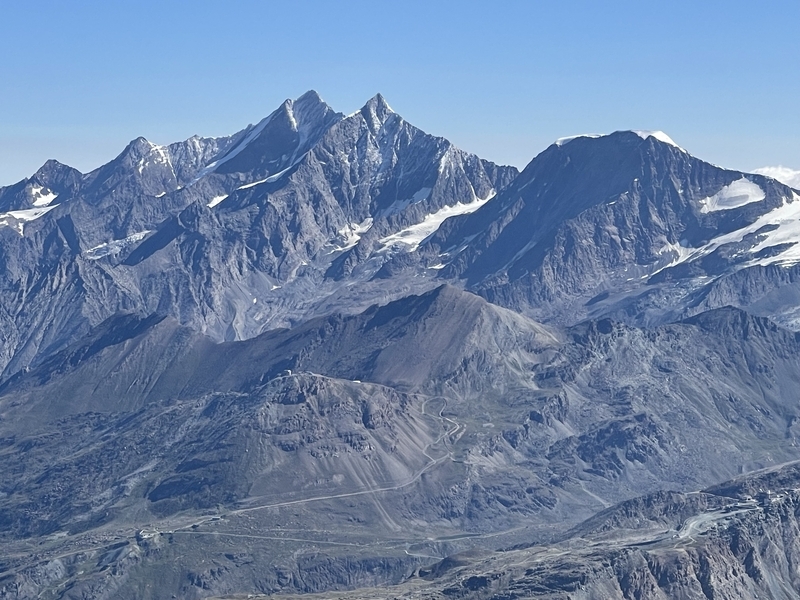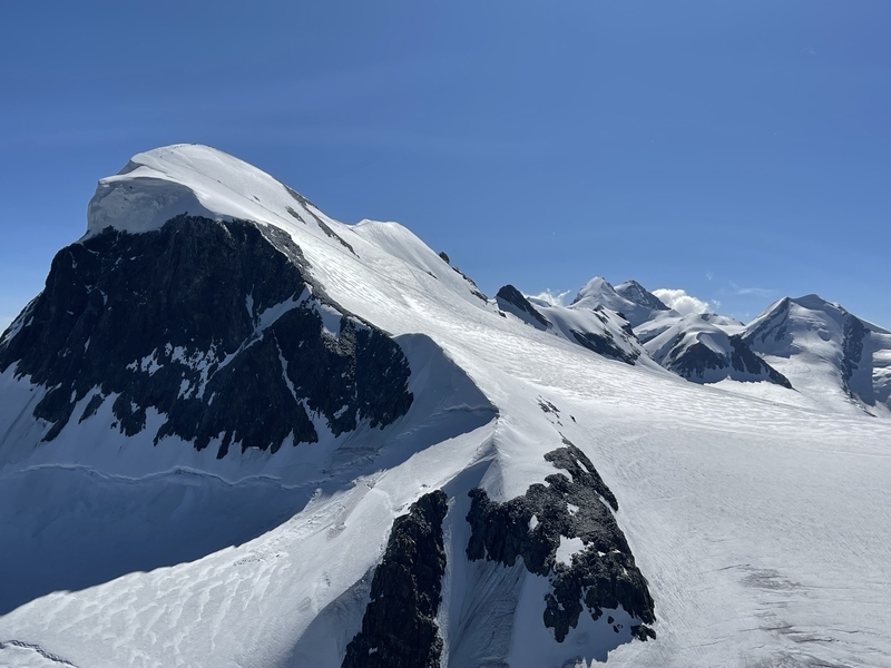 目的地は右奥、てっぺんの丸みを帯びている山がブライトホルン(標高4,164m)、右奥の小さな尖り山がクライン・マッターホルン(小さいマッターホルンという意味;標高3,817m)